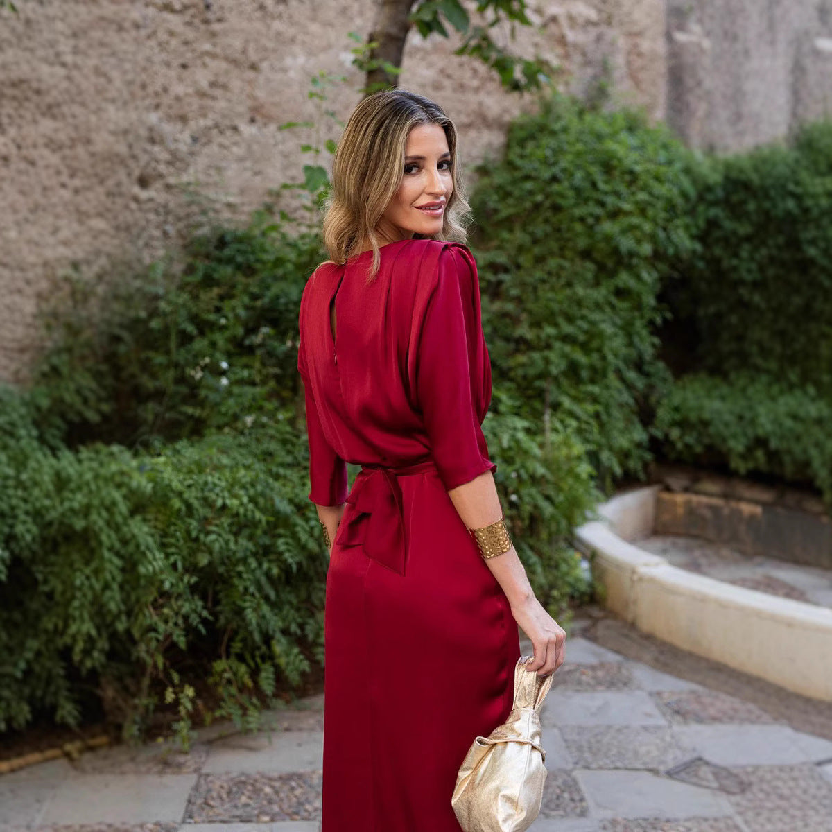 Jednobarevné saténové midi šaty s kulatým výstřihem a krátkým rukávem