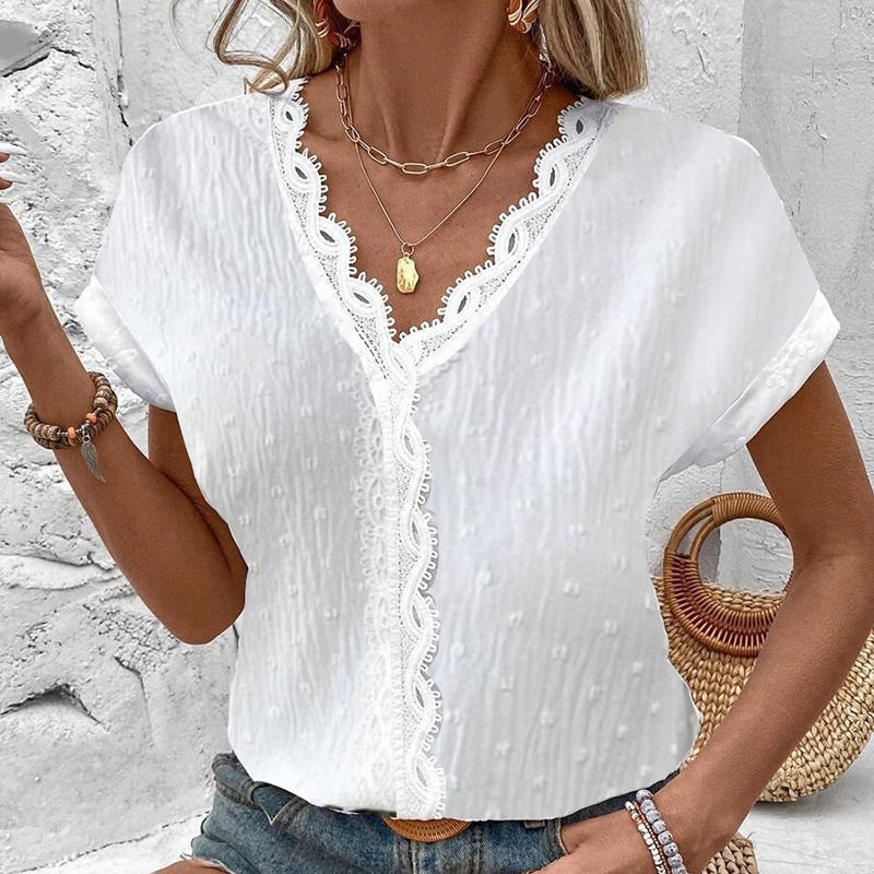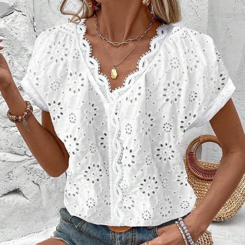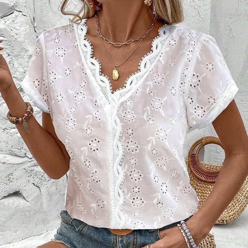 Elegantní bílá krajková halenka s krátkými rukávy a výstřihem do V