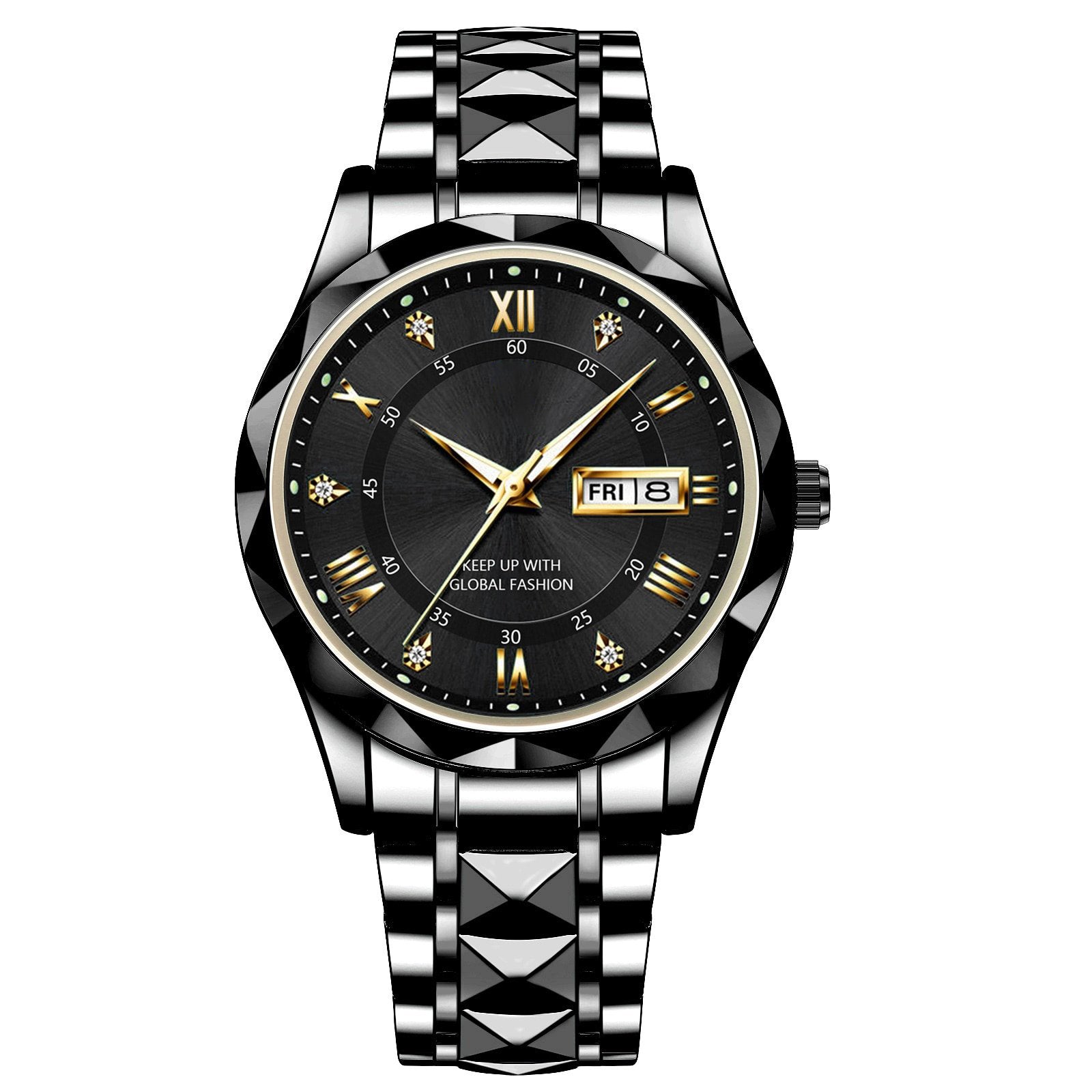 Pozvedněte svůj styl s naším klasickým designem obchodního oblečení. Stylová zlatá luneta osázená masivními diamanty doplňuje černý ciferník s velkým ciferníkem a zlatými indexy (1,6"/40 mm). Nadčasové módní prohlášení pro moderního muže!