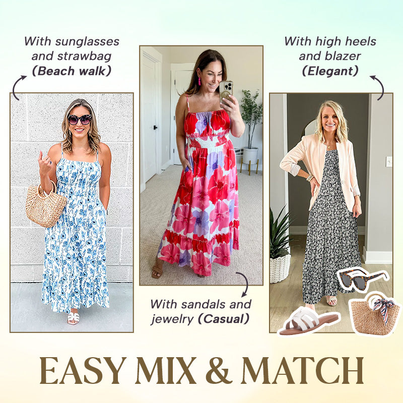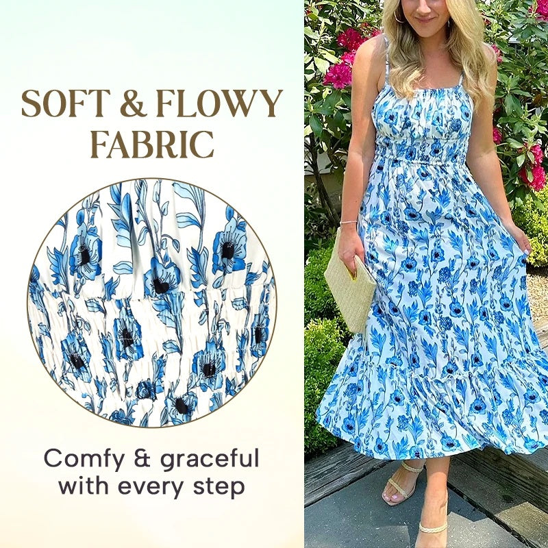 Vychutnejte si eleganci bez námahy s našimi letními květinovými šaty Cami Maxi, zdobenými okouzlujícím květinovým potiskem, praktickými kapsami, super měkkou a pružnou látkou pro vaše celodenní pohodlí!