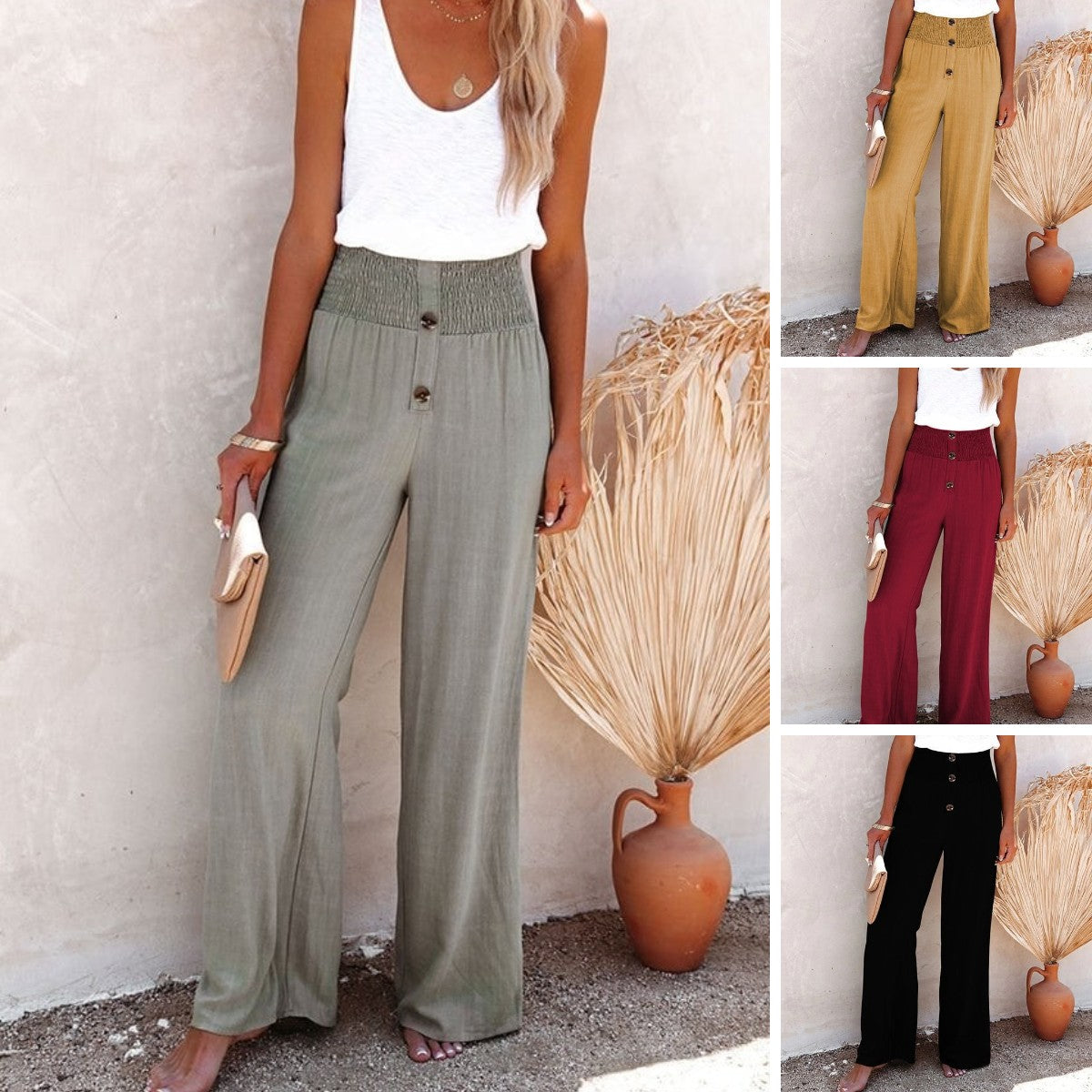 Vlastnosti: Dámské kalhoty jsou jednobarevné, elastický pas, široká nohavice, knoflíky pro ženy, letní kalhoty, pohodlné a šik.