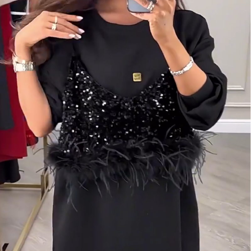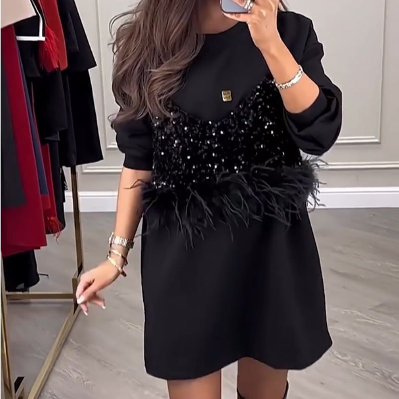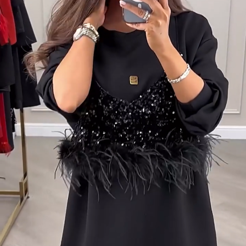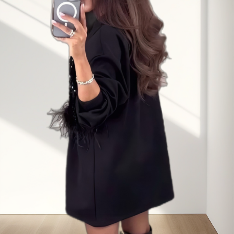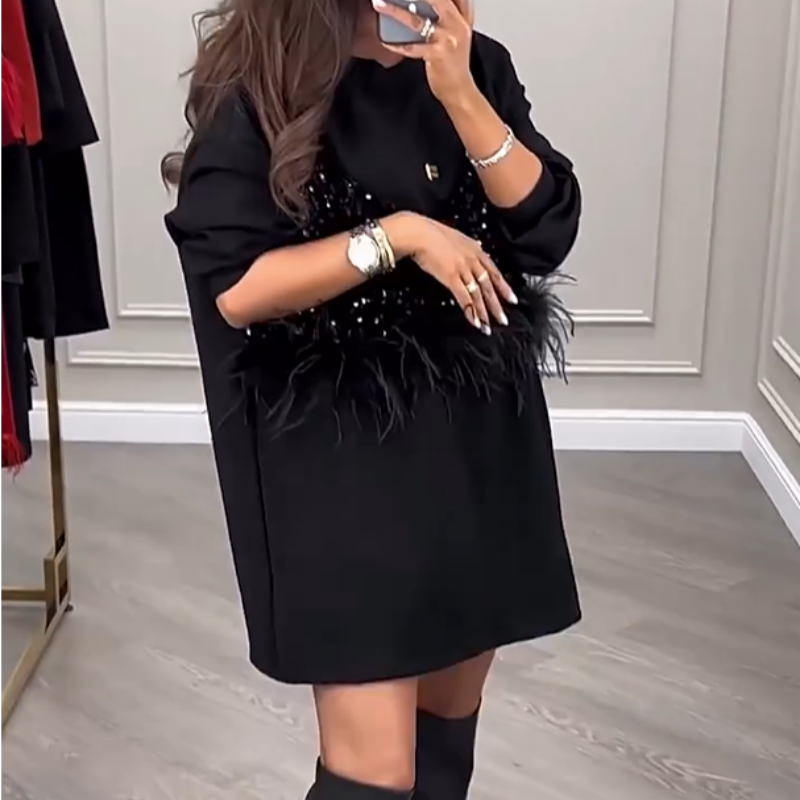MÓDNÍ VZHLED PEŘÍ - S módními detaily z umělého peří dodávají tyto šaty vašemu outfitu zábavný, ale sofistikovaný prvek, který zvýrazňuje váš celkový vzhled.