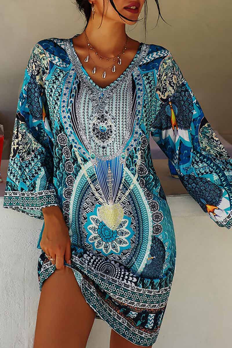 Dámské neformální šaty s dlouhým rukávem a výstřihem do V s etnickým potiskem