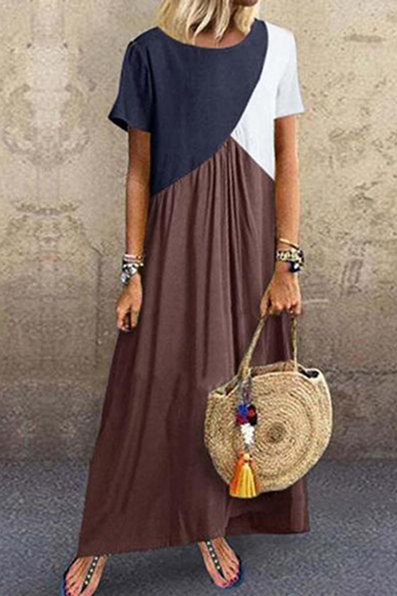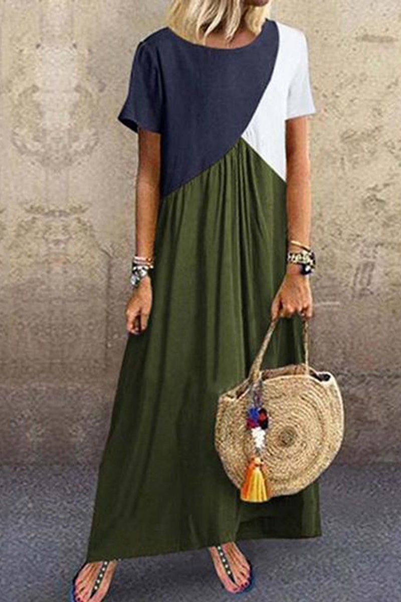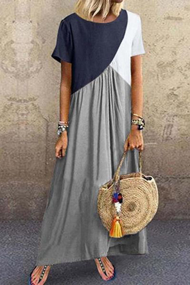 Dámské maxi šaty s nepravidelným krátkým rukávem v geometrickém barevném kontrastu