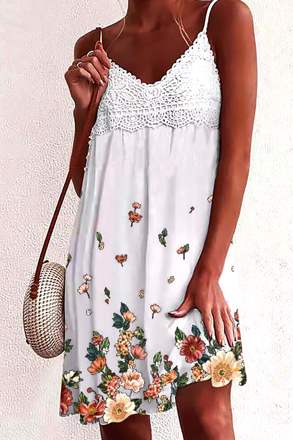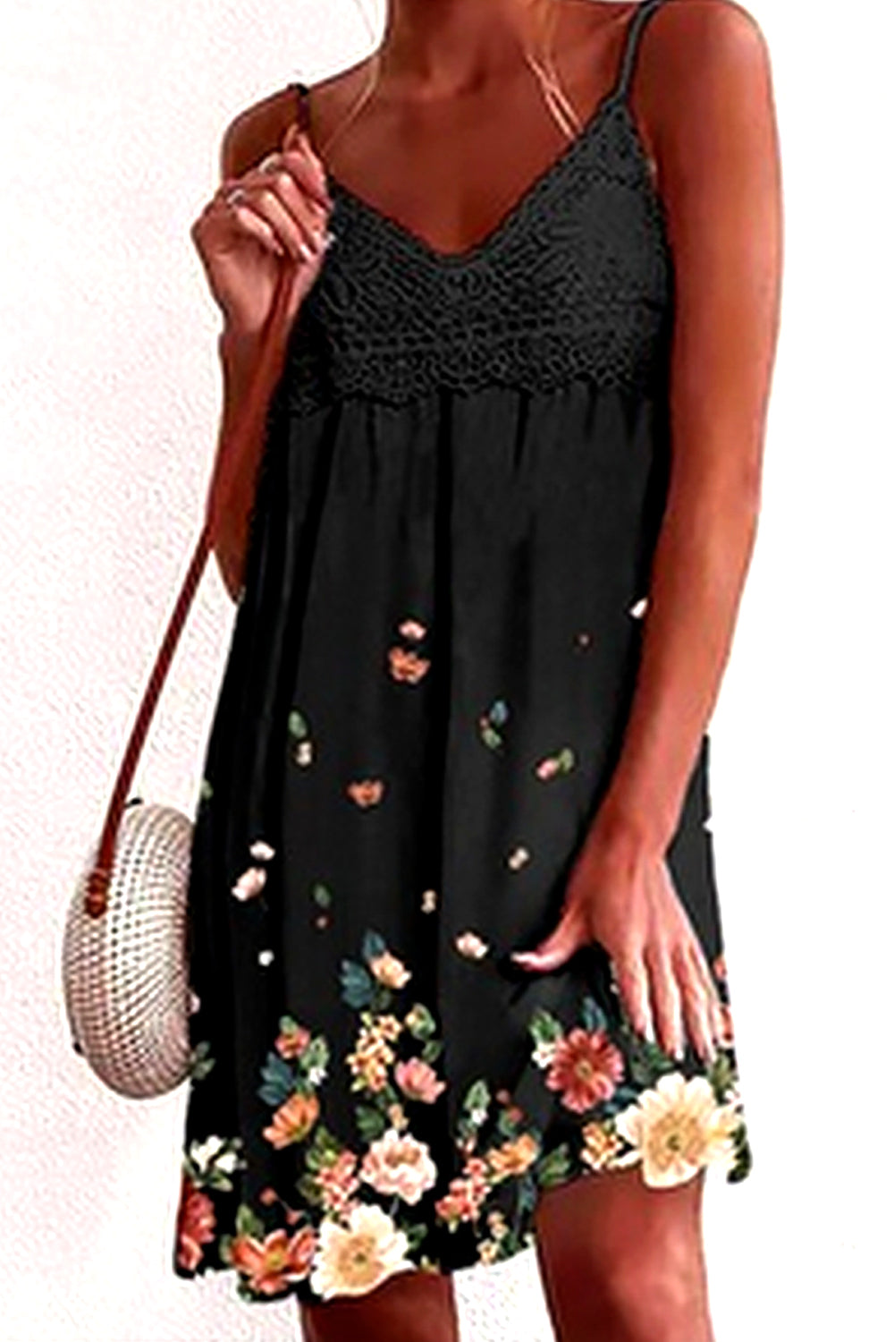 Dámské tenké šaty bez rukávů s krajkovým výstřihem do V s potiskem na ramínka