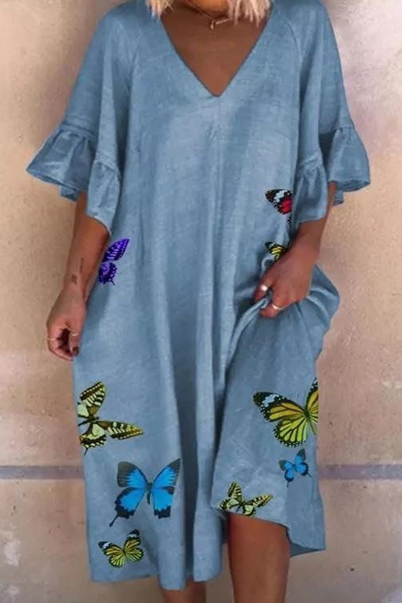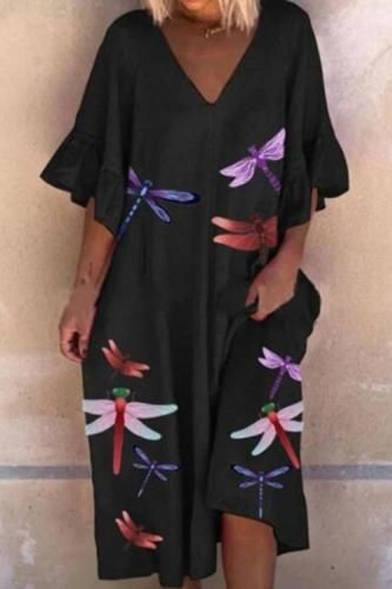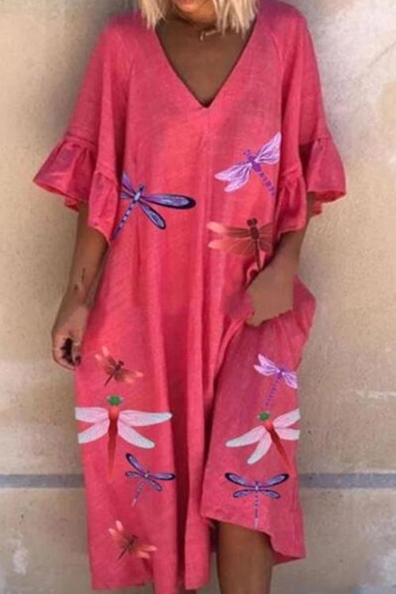 Dámské neformální šaty s potištěnými V volánovými rukávy