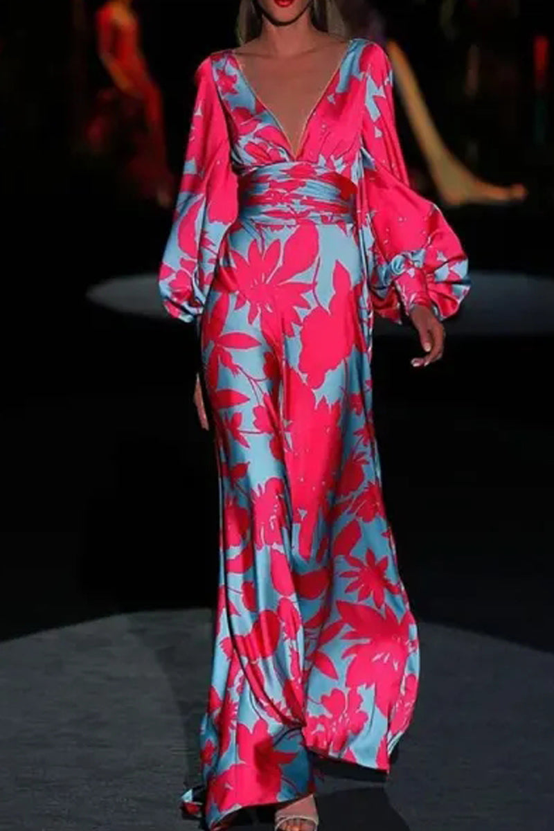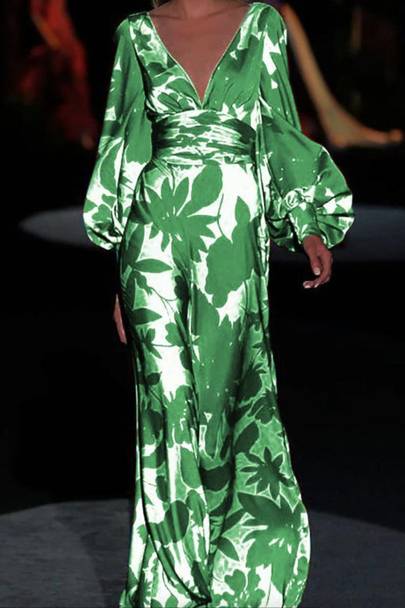 Dámské úzké šaty s balonovými rukávy s módním potiskem a výstřihem do V. Maxi šaty