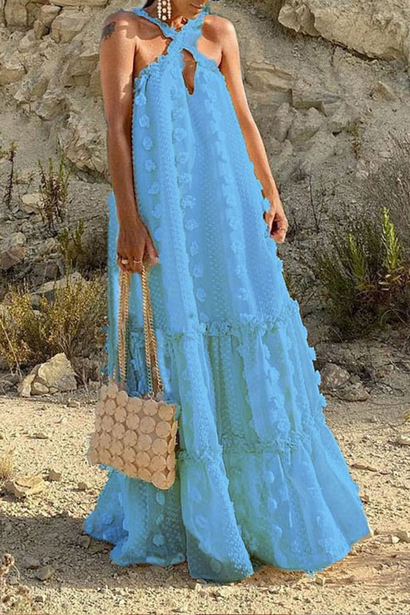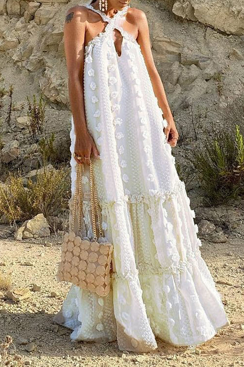 Dámské jednobarevné 3D květinové dortové šaty s maxi ohlávkou na krku