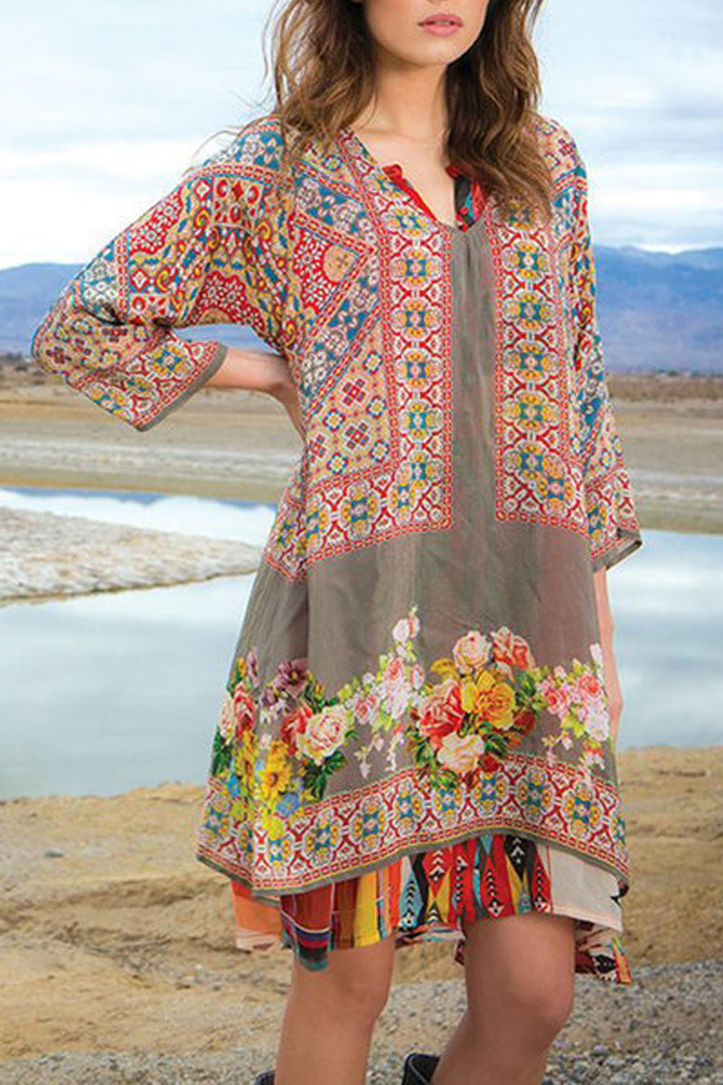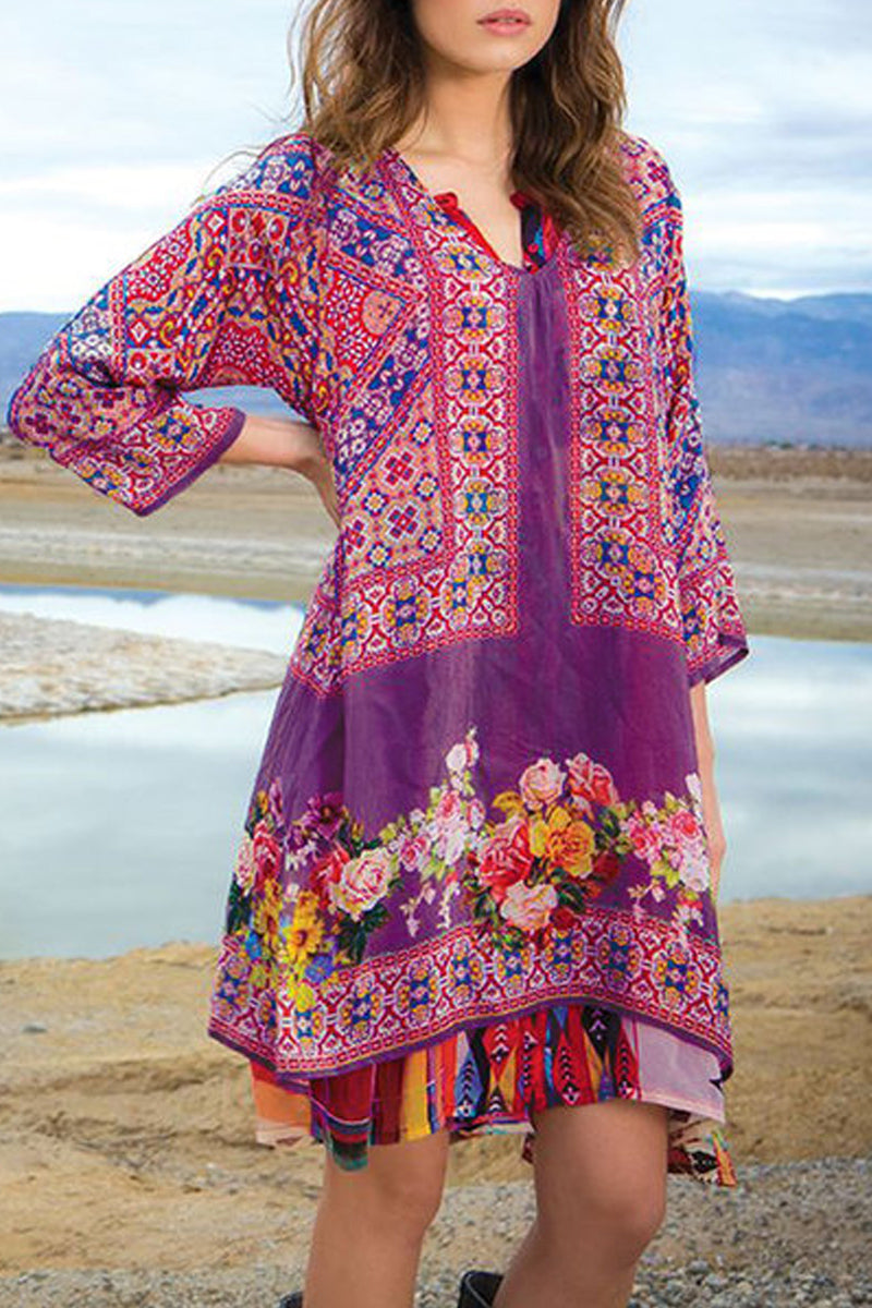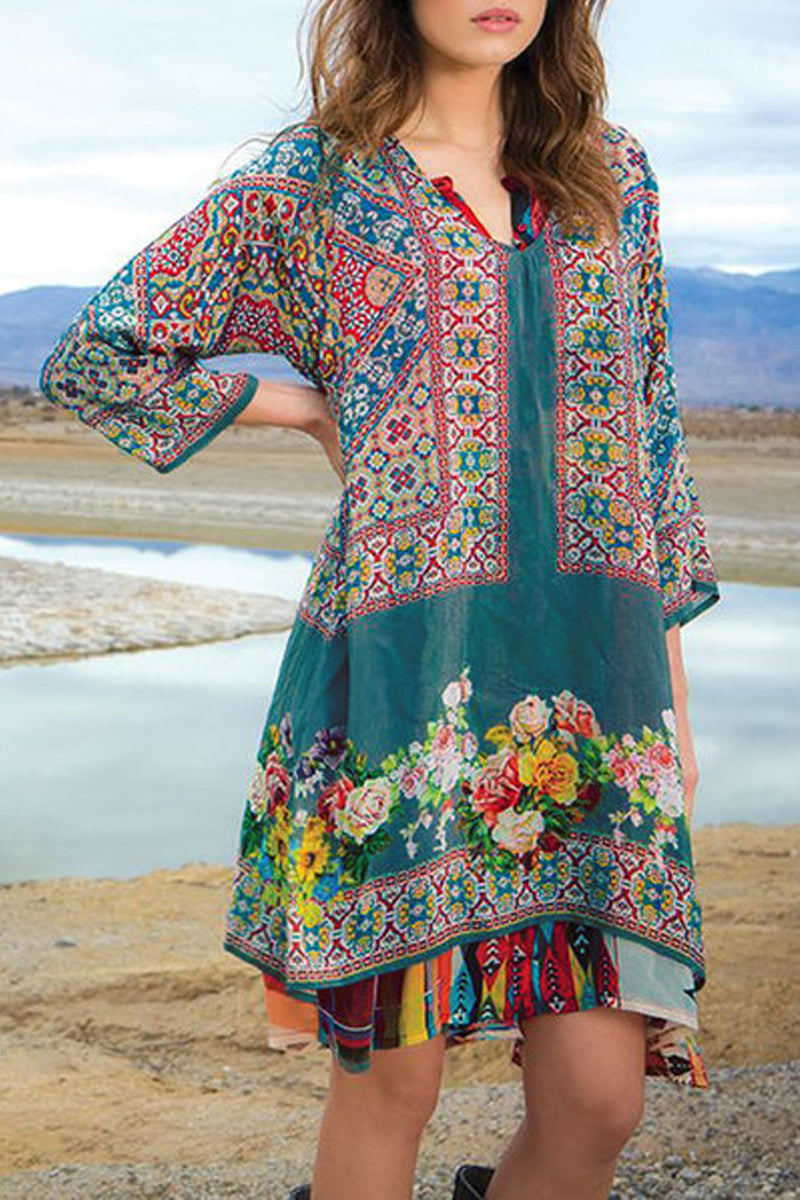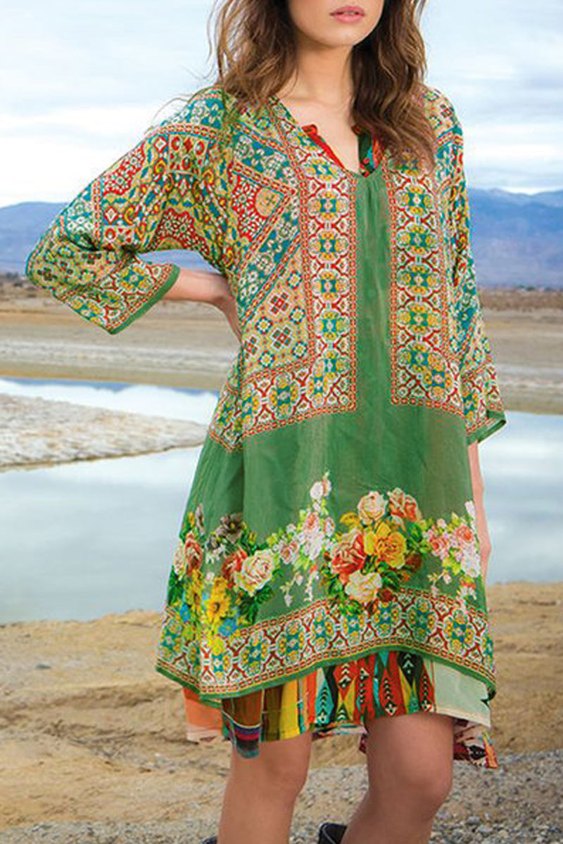 Dámské midi šaty s 3/4 rukávem a výstřihem do V s potiskem